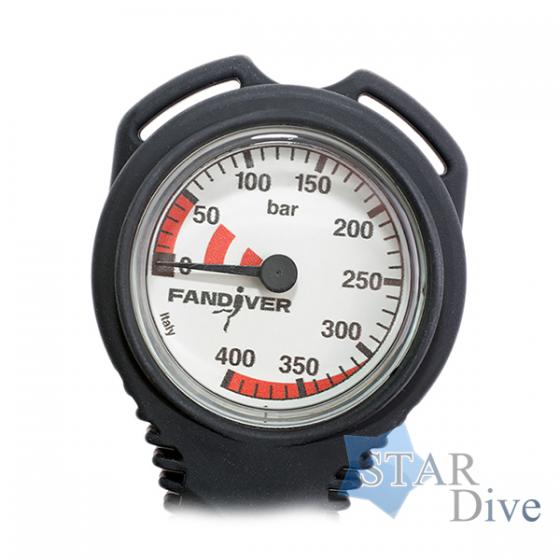 Манометр для дайвинга FanDiver Compact. Шкала прибора размечена на 400 Бар секциями по 50 Бар с ценой деления 10 Бар. Специальная цветная индикация облегчает считывание информации.